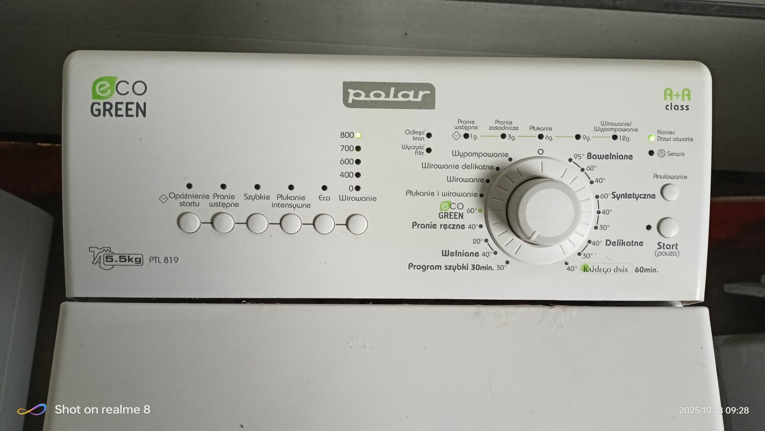 Sprzedam sprawną pralkę Polar z górnym wsadem. Wirowanie 800 obr/min, wsad 5.5 kg. Posiada program krótkiego prania 30 min.Stan dobry.